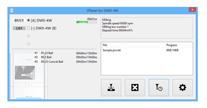 Purchase of the DWX-4W includes open-architecture CAM software that accepts all STL file types and supports the milling of relevant materials. This easy-to-use software features a user-friendly interface and simple workflow that promotes a short learning curve. Its features include automatic nesting and placement options to help maximize efficiency and pre-defined milling procedures for direct software-to-mill functionality without interruption during tool path calculation.