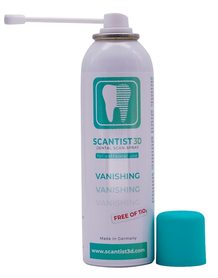 The revolutionary feature of the brand product "SCANTIST 3D - vanishing" is that the coating evaporates (sublimates) independently after the scanning process. SCANTIST 3D - vanishing thus eliminates fundamental application problems of dental 3D scan sprays in the CAD/CAM process, especially in sensitive areas. Since the coating evaporates by itself, there is no need for the otherwise time-consuming subsequent cleaning of the scan objects and the laboratory environment. This results in enormous time and cost savings for users in dental practices, for dental treatment, for the production of dental prostheses, in prosthetics and in orthodontics.